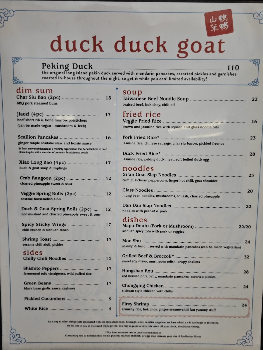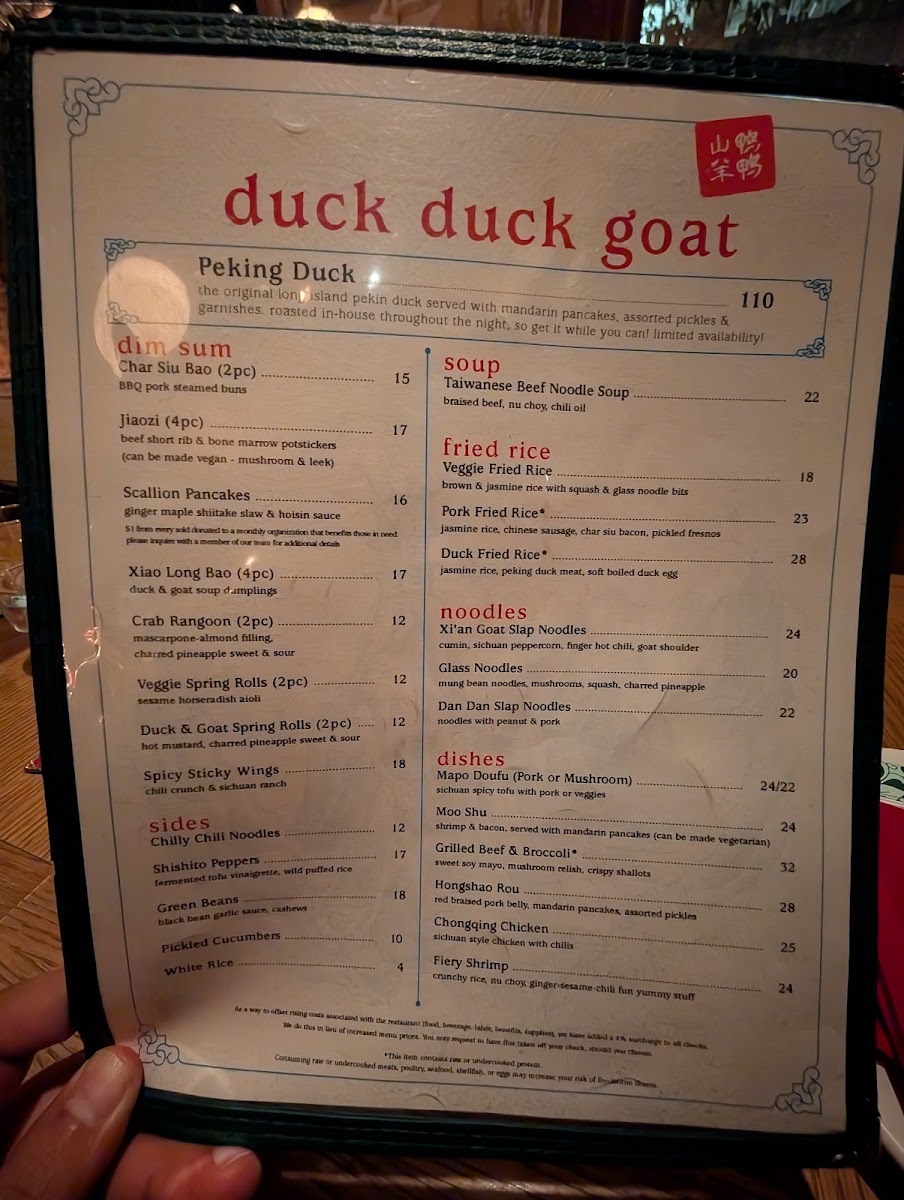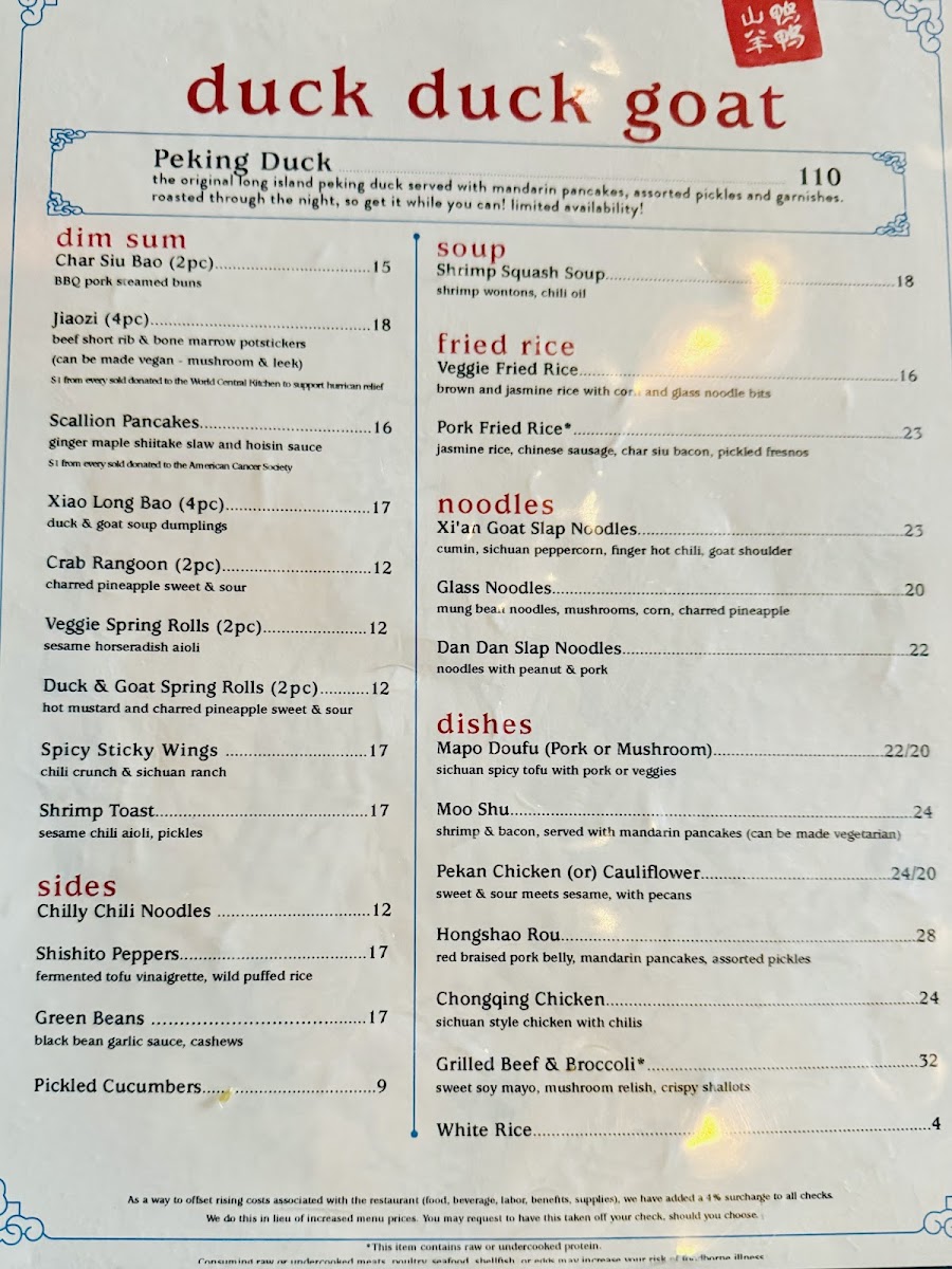 Duck Duck Goat offers a menu that blends traditional Chinese flavors with creative, casual dining elements. Its dishes range from comforting noodles and rice bowls to playful small plates, making it easy to enjoy a shared meal in a lively setting. Whether you're here for a relaxed lunch, an approachable dinner, or a vibrant night out, the menu invites exploration with options like rich Dan Dan Slap Noodles, savory Xiao Long Bao soup dumplings, and the iconic Peking Duck.