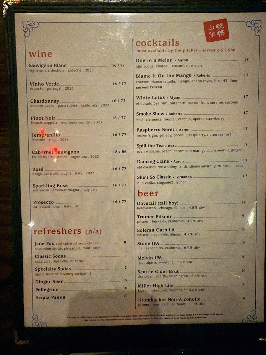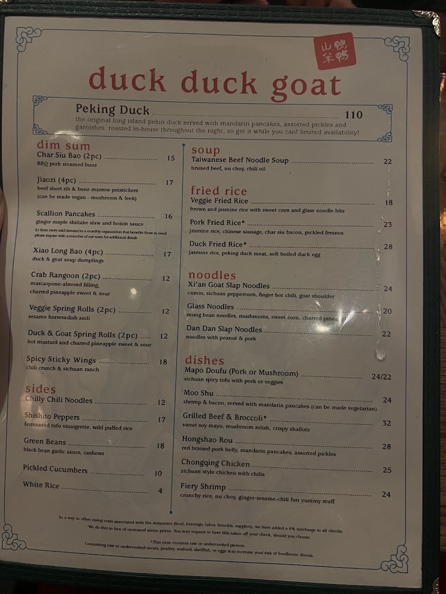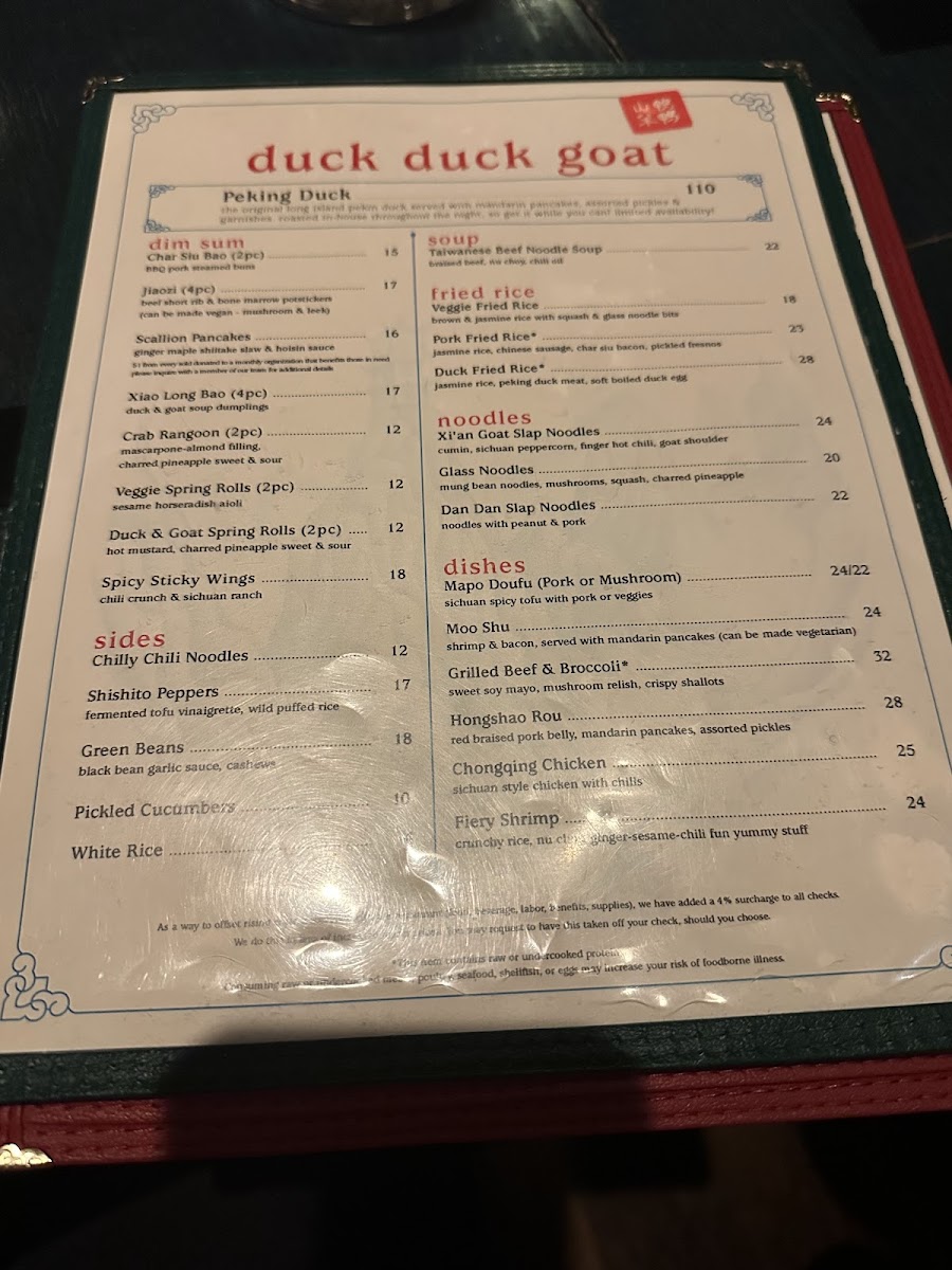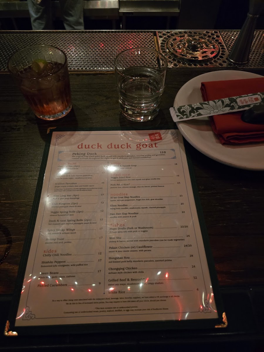 Duck Duck Goat offers a menu that blends traditional Chinese flavors with creative, casual dining elements. Its dishes range from comforting noodles and rice bowls to playful small plates, making it easy to enjoy a shared meal in a lively setting. Whether you're here for a relaxed lunch, an approachable dinner, or a vibrant night out, the menu invites exploration with options like rich Dan Dan Slap Noodles, savory Xiao Long Bao soup dumplings, and the iconic Peking Duck.